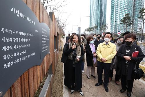 [È£ÅÚ°ü±¤·¹Á®½Å¹®´º½º=Á¤ÁöÀ± ±âÀÚ] ¡®±âºÐ ÁÁÀº º¯È­, ǰ°Ý ÀÖ´Â °­³²¡¯À» ½ÇÇö ÁßÀÎ °­³²±¸(±¸Ã»Àå Á¤¼ø±Õ)°¡ Áö³­´Þ »ï¼ºµ¿ °æ±â°íµîÇб³ ¾ð´ö±æ 400m ±¸°£À» ¡®¹®Á¤Èñ ½ÃÀα桯·Î Á¶¼ºÇß½À´Ï´Ù. ±¸´Â ¡®¼­½Ã¡¯, ¡®ºñ¸Á·Ï¡¯, ¡®°Ü¿ï »ç¶û¡¯ µî ½ÃÀÎÀÇ ÀÛǰ 8ÆíÀ»¡¦